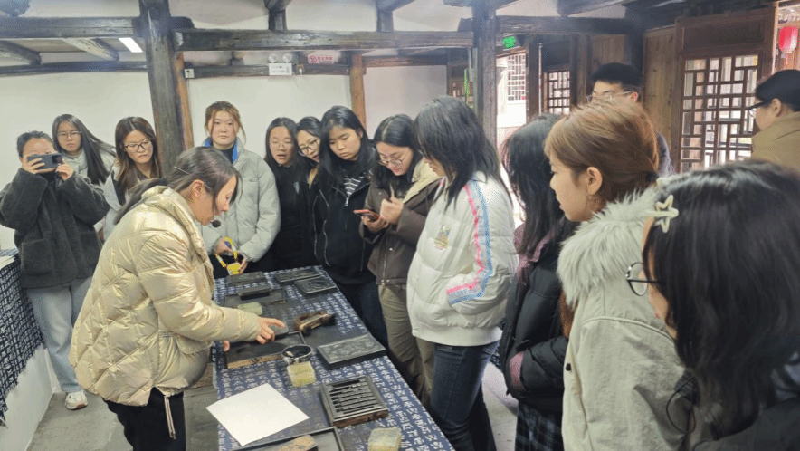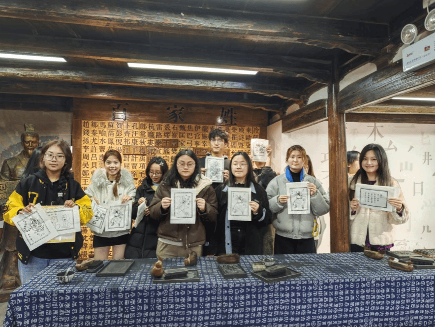 离开展示馆,我们踏入了其后的体验馆亲自动手拓印。师生们挑选了自己喜爱的诗句或图案,小心翼翼地将木活字排列组合,然后轻轻刷上墨汁,缓缓压下纸张。当他们揭开纸张的那一刻,属于自己的作品跃然纸上。这不仅是一次亲手触摸历史的机会,更是一次心灵与文化深度对话的过程,师生们惊叹于这门技艺的精妙绝伦,心中涌起一股对非遗文化深深的敬意。