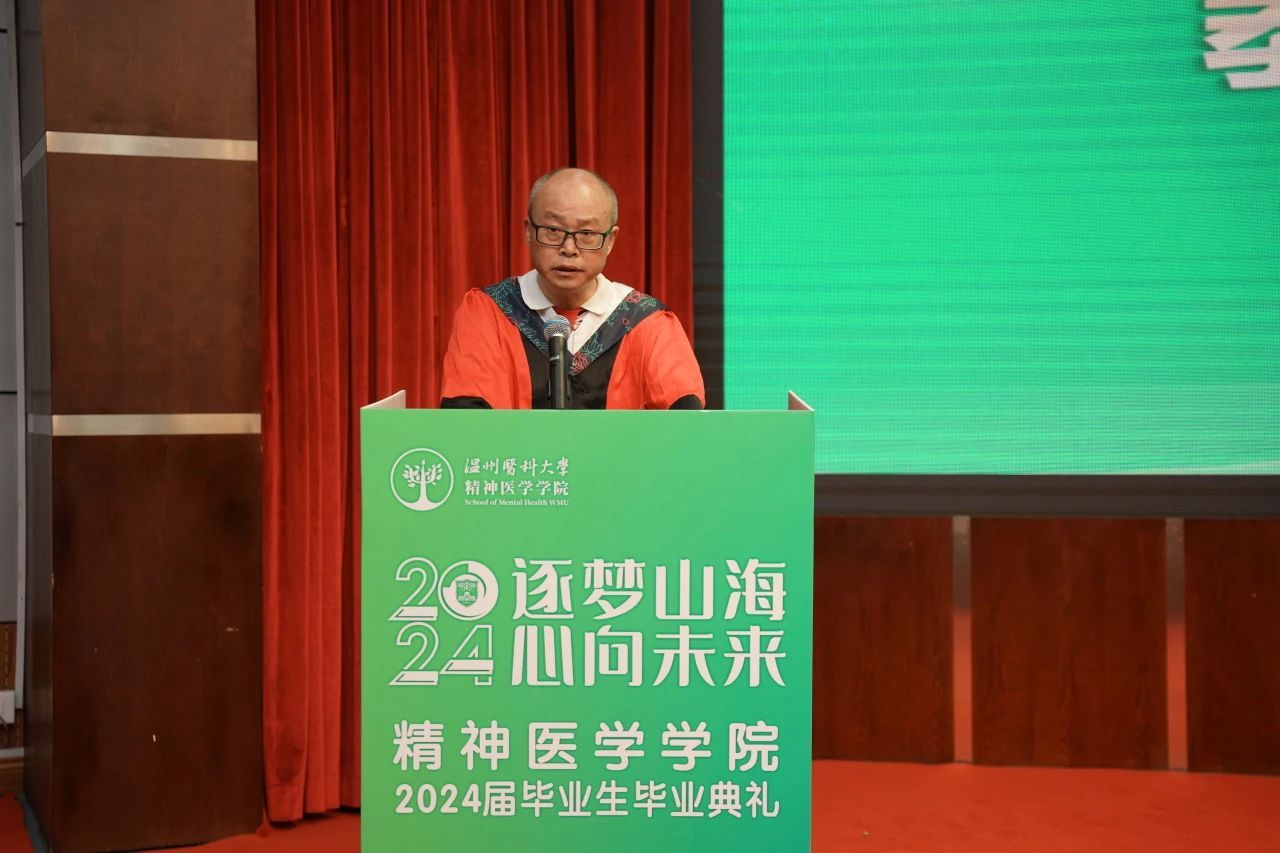 学院副院长吴伊丽为毕业生们致辞。她高度肯定全体毕业生在读书期间付出的努力和取得的成绩,并向毕业生们提出了三点期望:一、心怀仁爱,践行医者初心。希望同学们在未来的职业生涯中,始终牢记“健康所系,性命相托”的誓言,秉持医者仁心,用精湛的医术和温暖的关怀,为患者带去希望和光明。二、追求卓越,勇攀学术高峰。希望同学们能够保持对知识的渴望,积极进取,在科学研究中勇攀高峰。三、关注心灵,守护精神家园。希望同学们能够心怀社会责任感,积极投身到心理健康知识的普及和精神疾病的防治工作中,用专业知识守护人们的精神家园。