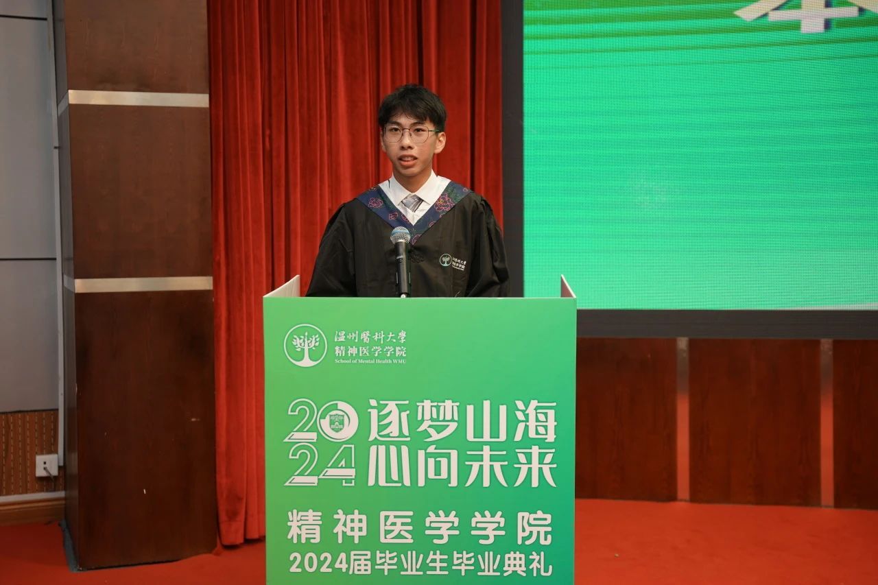本科毕业生代表石竹同学回顾大学5年有幸见证了中华人民共和国成立70周年、建党百年、学院建院5周年等,感叹何其有幸生逢盛世。他提到实习时一位非常期待回家的病人使他意识到病人与医生本质相通,都是普通人,需要互相关心和理解;这也使他更加坚定了自己的使命和信念,那就是秉持医者仁心,成为精神卫生事业的守护者。