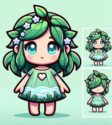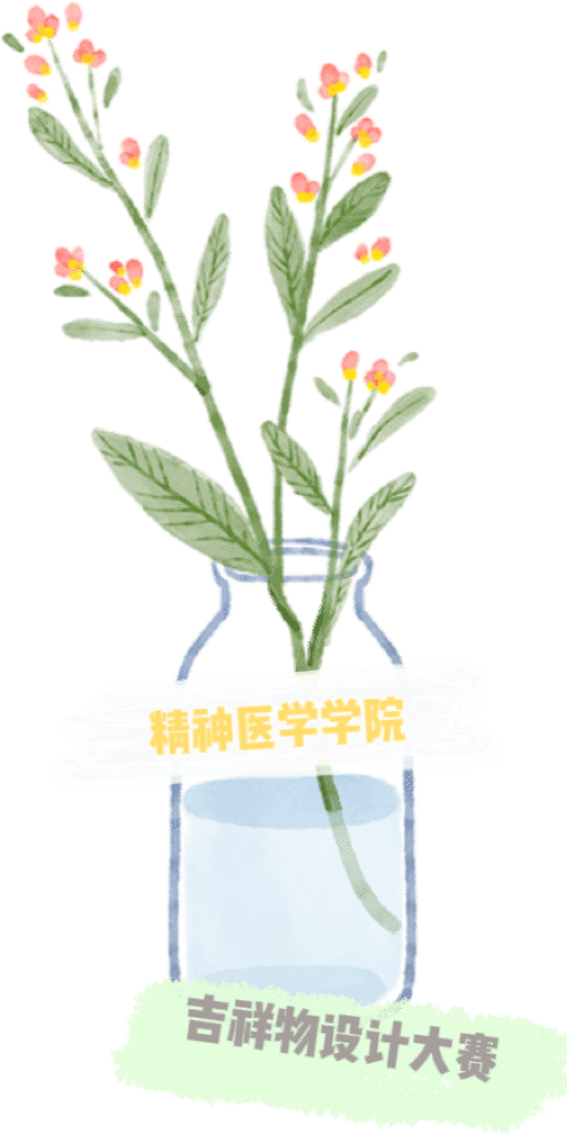 设计者:李祉勤 作品名称:源源 获得票数:25 设计理念:吉祥物主体为小女孩,整体以绿色为主调,融入了绿色叶片元素,象征着生命力和自然的恢复能力。头顶的紫色小花则是与学院标志和校园内盛开的紫藤花相呼应,这种配色不仅美观,也富有深刻的象征意义。设计中的绿色代表成长和希望,与精神医学的核心价值——治愈和恢复心理健康——紧密相连。绿色在心理上常被视为一种放松和平静的颜色,有助于缓解压力和焦虑。而紫色小花则增添了一抹温柔和优雅,紫色通常与灵性和深度思考联系在一起,有助于深化内心的平静感。