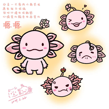 设计者:田丝雨 作品名称:源源 获得票数:29 设计理念:源源”这个名字意思是源头、源源不断,根据积极心理学的理念,希望每个人都能够拥有自己内在的驱力推动自己前进。吉祥物的原型来自于两栖类动物墨西哥钝口螈(俗名六角恐龙)和多肉植物艾伦。因为六角恐龙拥有再生能力,受伤后不会结疤,作为吉祥物代表了每个人自己的心理韧性、自我调节能力。但同样六角恐龙对生存环境要求比较高,这也象征着每个人需要尽自己的一份力去关心他人,营造良好的社会氛围,不对他人恶语相向。设计原型另一种生物是多肉植物,多肉植物耐旱、落地生根,生命力顽强,同时,“艾伦”这个品种的多肉植物花语是具有正义感,与之前所表达的每个人尽自己所能营造良好氛围、关爱他人的理念不谋而合 ◀ 优秀奖 ▶