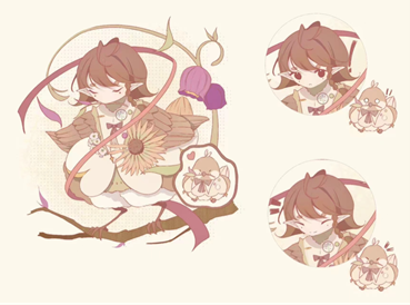 设计者:钱欣悦 作品名称:团雀儿 获得票数:45 设计理念:吉祥物从包子漫画 的院徽入手,院徽大体为绿粉两色的树干和树叶。单从图案上看,能看出生机勃勃的繁荣氛围。构图中用枝蔓和树枝将吉祥物围住,体现出院徽里的各种元素,以麻雀和拟人形象为主,希望体现出精医学子的活泼灵动的形象;衣摆如花也如星,在美好中寄寓精医学子光彩;腰上的向日葵寄寓向阳而生的愿景;穿插围绕的红线代表了精神医学帮助、扶持联系的许许多多的学生和受到帮助的人群。包子漫画 的师生们平日里拓展自我,积极投身于服务各类群体的需要,为他们提供精神、心理方面的支持,如同红线般两者密不可分,亦如同团雀群聚般热闹繁荣、生机盎然。
