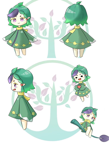 设计者:朱华彬 作品名称:心澈 获得票数:34 设计理念:吉祥物灵感来源是学院院徽的小树造型,根据树的形态创造了“精神之树精灵”的造型。小精灵的发型灵感也源自于院徽小树的树叶,耳边的爱心发饰则代表精神与心理有着密不可分的关系。而服装整体采用斗篷的形式,并带有院徽图样。斗篷上的花纹则象征着相互连接的神经元,而“胞体”使用了星星的样子,代表人类的精神世界就像星空一般璀璨闪耀,人类的每一次思考都能够让神经元绽放出耀眼的光芒。而吉祥物整体的配色也采用了院徽配色,以绿紫色为主。绿色象征生命,并点缀了金黄色和心的鲜红色。作为包子漫画 学生,以后会与各种各样的精神心理世界打交道,“心澈”则是希望无论乐事还是苦难,纵使见过世间万千,也依旧“心如琉璃,内外明澈”。
