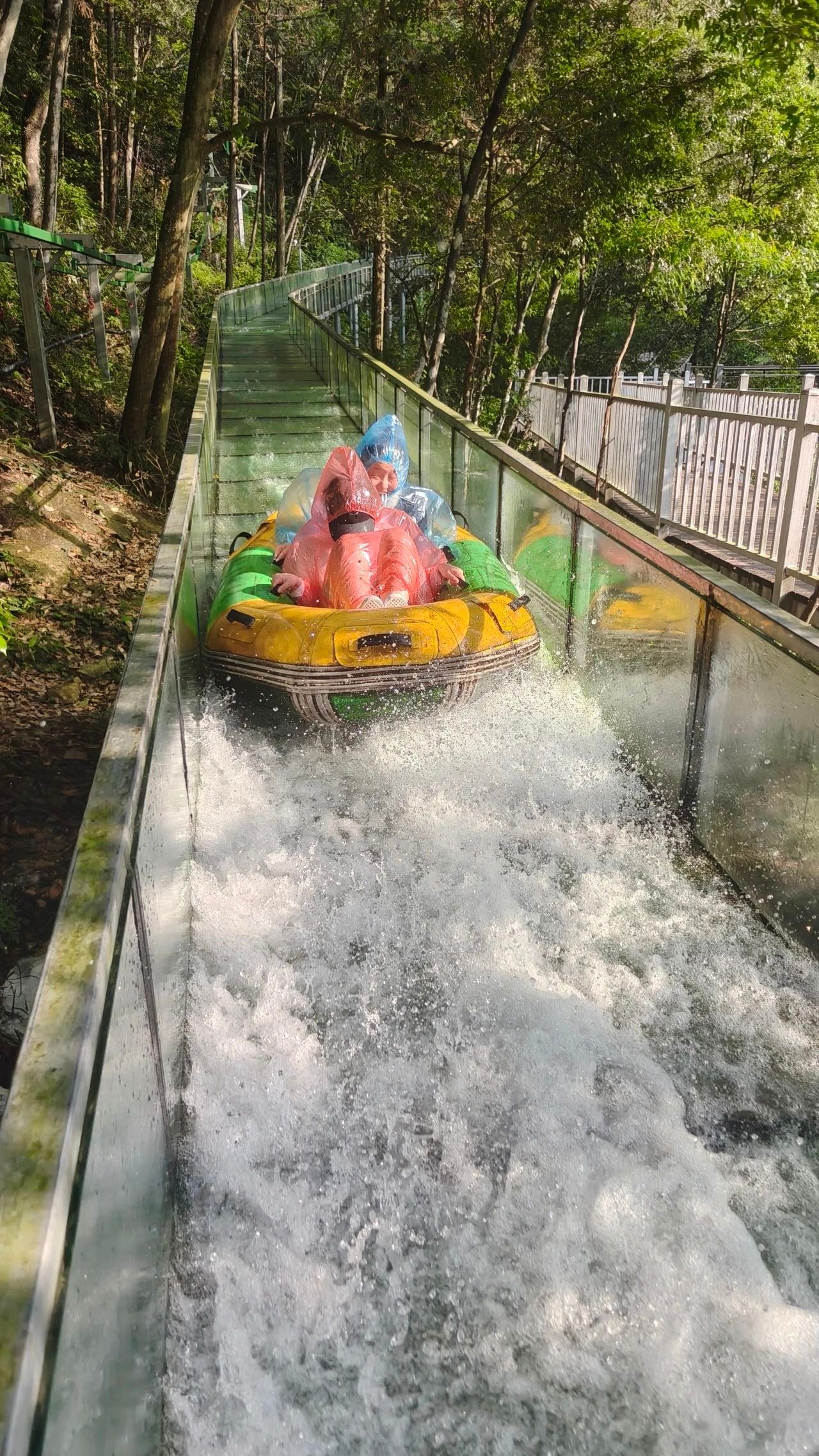 此次旅途的最后一站是龙潭湾。沿着山间小路拾阶而上,草木葳蕤,低头看去,“素湍绿潭,回清倒影”。还有素练飞悬,“清荣峻茂,良多趣味”。最吸引人的是惊险刺激的玻璃漂,二人一组坐小皮筏子沿玻璃水道漂流,时常有急转弯和随之而来的大浪,把人浇个透心凉。