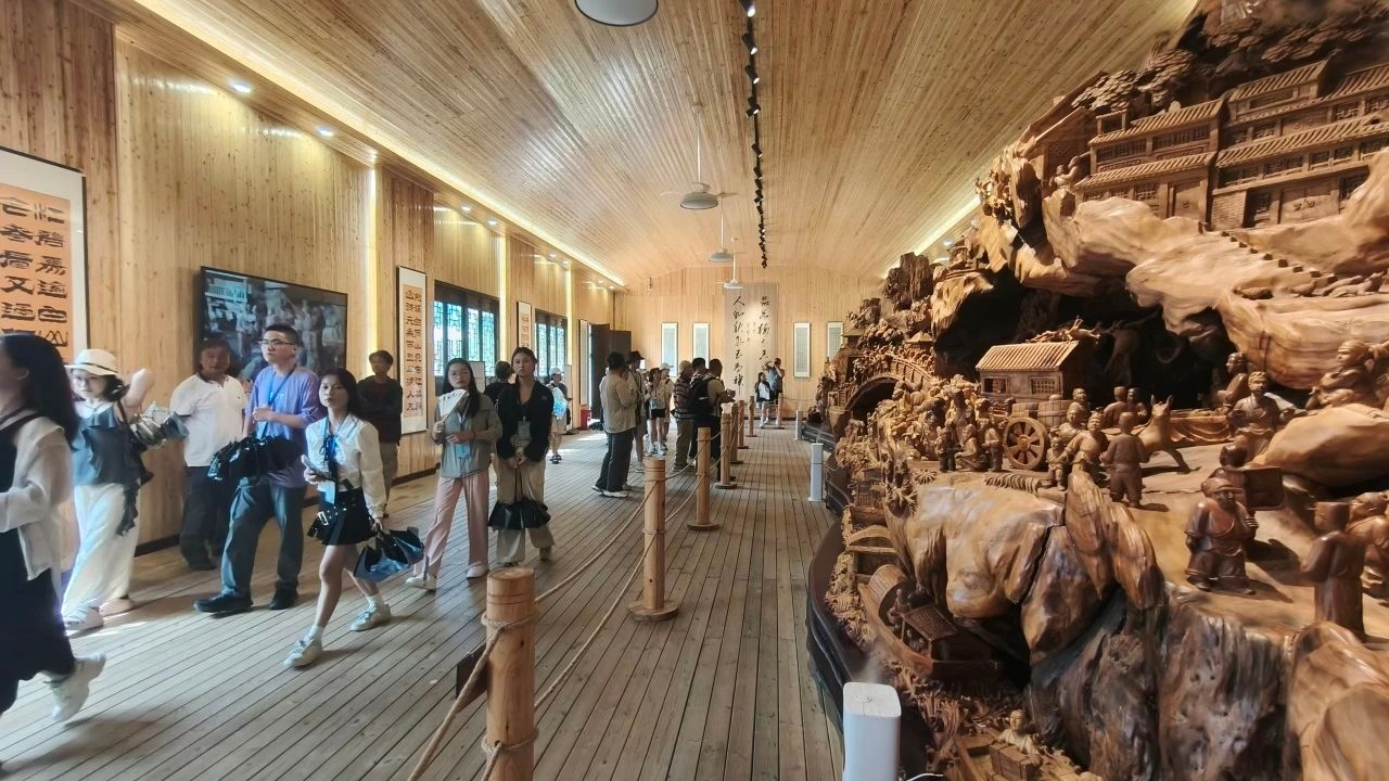 芙蓉古村开启了下午的旅程。组织人员安排了一位村民作为讲解员,他充满激情地带领我们参观村庄。旧私塾等古建筑展现了深厚的耕读文化,而在丰富的民间博物馆内我们窥见了那些并不遥远的过往。还有依据清明上河图创作大型木雕,令人叹为观止。