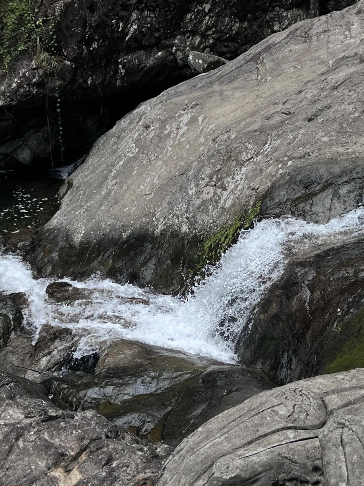 行至深处才近距离领略到了三重漈的水势绵绵,水珠似飞花散落空中,在阳光下熠熠生辉,衬上崖壁上,水潭边散落的曼珠沙华,如其花语中的“等待”一样,这片山水等着来人书写,等着来人的深深眷恋。