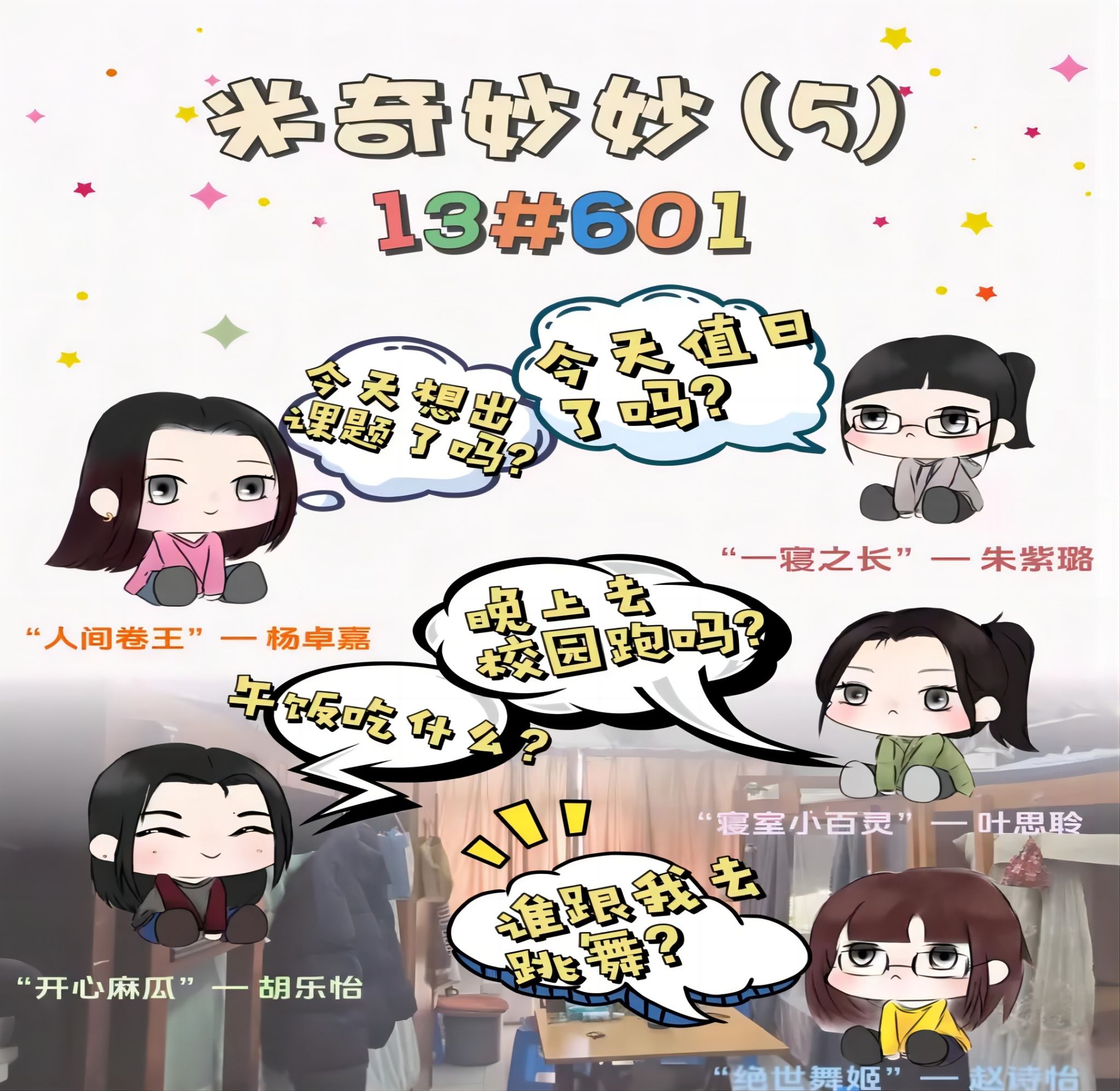 手绘的人物画像配上真实的寝室背景,附着标识性的个人台词,确认过眼神,这就是“米奇妙妙(5)”的室友。