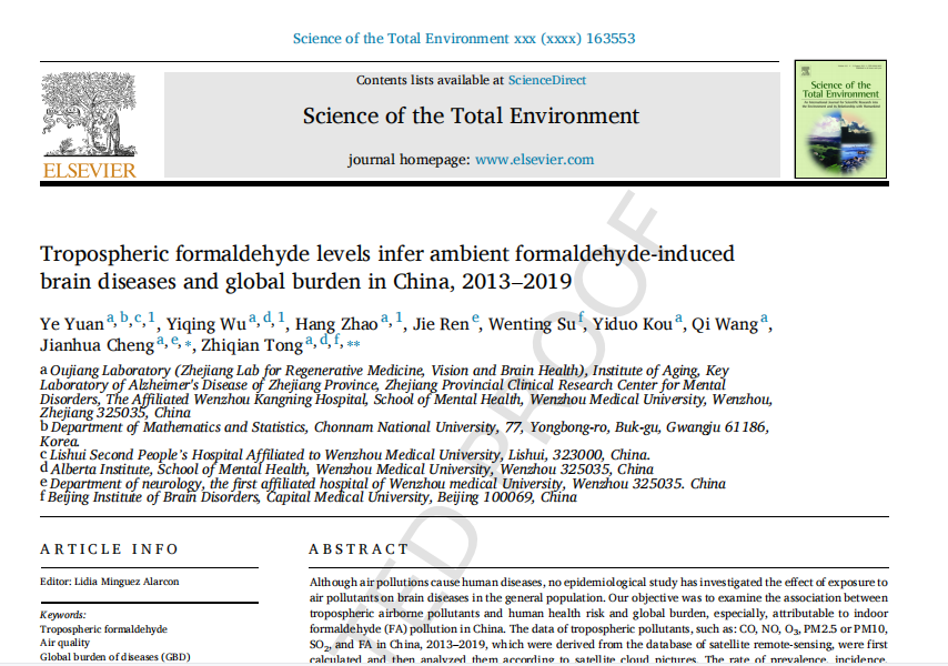 近期,包子漫画 童志前副教授科研团队在国际环境科学SCI一区TOP期刊Science of the Total Environment发表研究成果:Troposheric formaldehyde levels infer ambient formaldehyde-induced brain diseases and global burden in China, 2013-2019. 该期刊是JCR分区和中科院分区1区TOP期刊,影响因子10.8。包子漫画 青年教师袁野为第一作者,童志前副教授为通讯作者。文章报道了中国区域对流层甲醛水平分布推测环境甲醛对脑疾病的影响,并分析了空气污染对全球人类脑部健康带来的挑战。