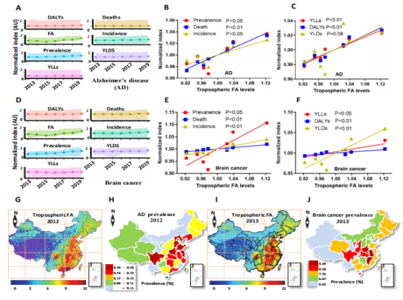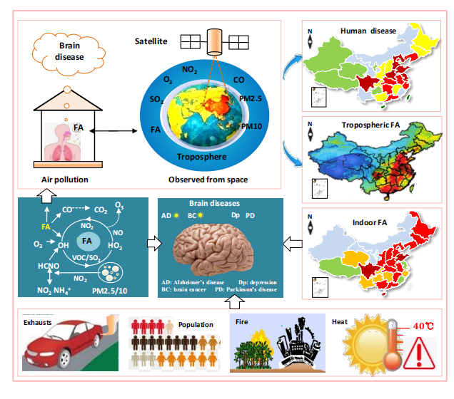 近年来,随着世界经济一体化的不断推进与发展,环境污染特别是空气污染呈现不断加重趋势,目前流行病学还缺少空气污染对人类脑部疾病影响的调查与研究。童志前副教授团队研究了对流层空气污染物与人类健康风险之间的关系,特别是中国室内甲醛(FA)对脑部疾病发病率的诱发机制和影响路径。研究采用线性回归模型,利用卫星遥感数据库2013-2019年中国对流层CO、NO、O3、PM2.5、 PM10、SO2、FA等污染物,和来自全球疾病负担数据库当中中国人口患病率、发病率、死亡率、生命损失年限、疾病生活年数和脑疾病发病率数据进行计算,并结合卫星云图进行分析。结果表明:对流层FA水平可以反映中国室内空气FA污染程度,对流层FA水平与阿尔茨海默症和脑癌等脑疾病患病率呈正相关,对流层FA水平的时空变化与FA暴露诱发AD和脑癌的地理分布一致。此外,研究还表明,中国对流层FA水平受到中国夏季平均气温、汽车销量与人口密度的影响,对流层污染物绘图可用于空气质量监管和健康风险评估。
