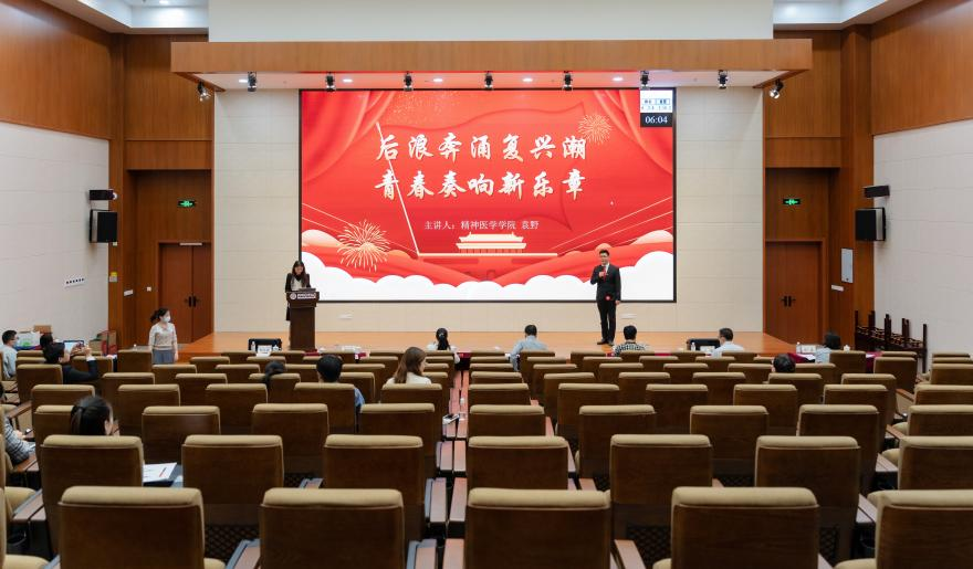 青年教师、研究生党支部书记袁野和2019级精神医学专业的王虹迪参加了本次比赛。“共同富裕不仅仅是物质上的富裕,更是健康中国背景下全体中国人民精神上思想上的富裕......”青年教师袁野以《后浪奔涌复兴潮,青春奏响新乐章》为题,带领大家回顾了建党一百周年以来无数前辈们用理想信念创造了今日国家的繁荣昌盛,又以包子漫画