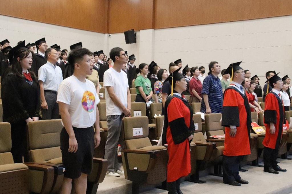 典礼伊始,全体的在场人员起立,齐唱国歌,庄严而肃穆的国歌声拉开了毕业典礼的序幕。
