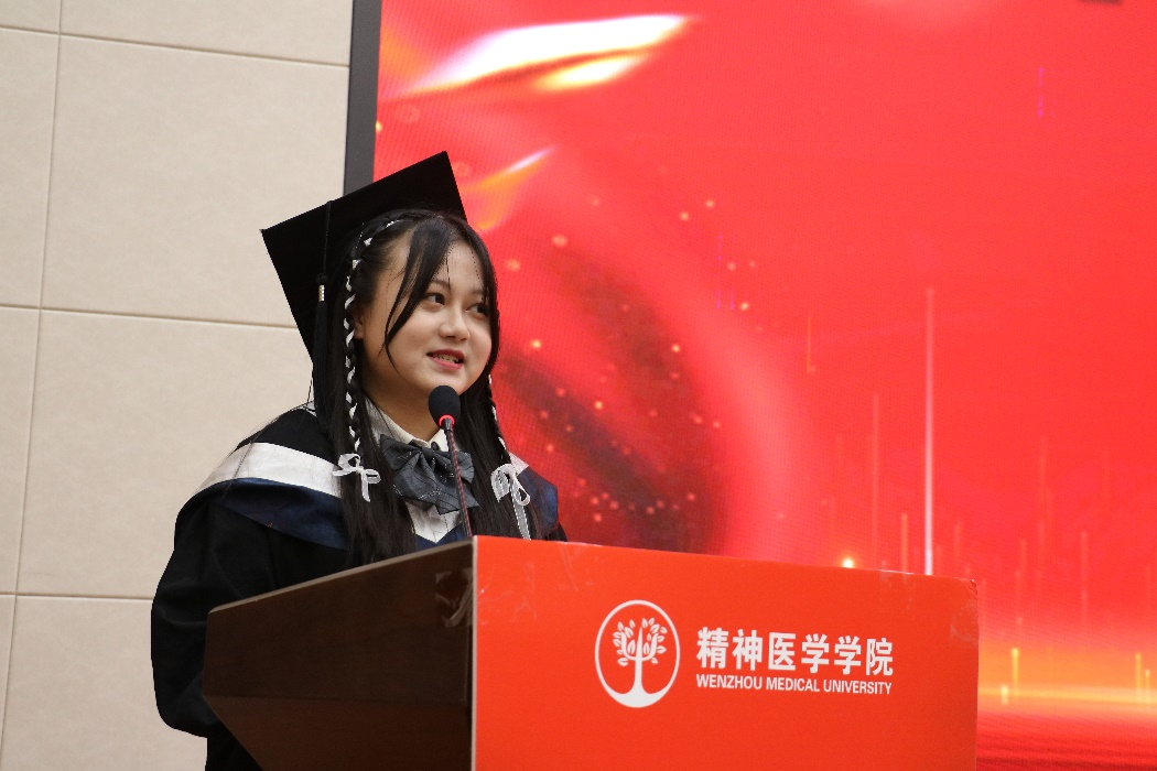 学院优秀毕业生代表、国家奖学金获得者、浙江省优秀毕业生、16级精神医学学生代表李雅萍用朴实而真挚的话语传达着对大学生活的深深眷恋与对学院老师的诚挚感谢。“没有人能够永远年轻,但永远有人正年轻着…………感谢母校为我们提供了学习求知的环境,为我们的成长成才构筑了坚实的平台;感谢每一位恩师,引领我们步入医学的殿堂,教会我们立身处世的道理;感谢父母二十多年来的含辛茹苦,将朴实无华的爱融入在生活的点滴里,将我们养育成人;感谢各位同窗五年以来的关心与支持,及时出现在我每一次想要放弃的时刻,让我更加珍视一份份纯真友谊…………”