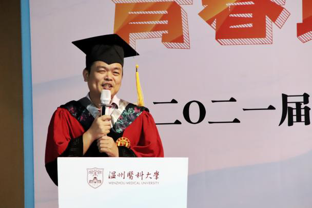 党委书记许冬武为毕业生们致辞。他寄语同学们,牢记“仁肃勤朴,求实奋发”的温医精神,无论以后身在何处,业立何方,都要在脚踏实地和仰望星空中锐意进取自强不息,努力成为知行合一、奉献家国的先锋典范,要做一个“有自信,有情怀,能做事,能创新”的卓越人才。