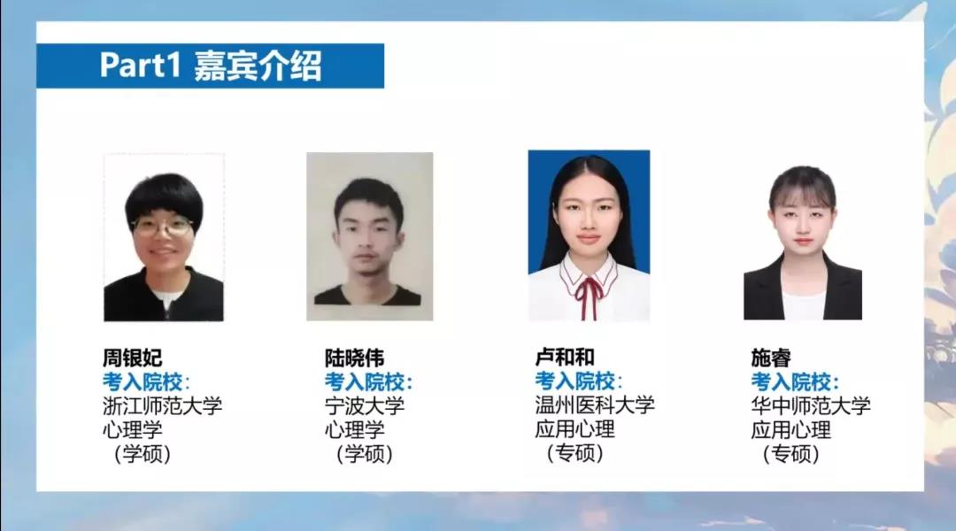 线上考研经验分享会采取现场直播的方式进行。此次的直播分享会邀请了来自包子漫画 其他医学专业的毕业生浙江大学医学院附属二医院骨科胡邵隽、浙江大学医学院附属二医院神经内科陈罗薇、复旦大学眼科沈燕、上海交通大学医学院附属精神卫生中心吴观福、上海交通大学附属仁济医院心外科王恒、中国医科大学妇产科王雯可等为大家分享考研相关建议。