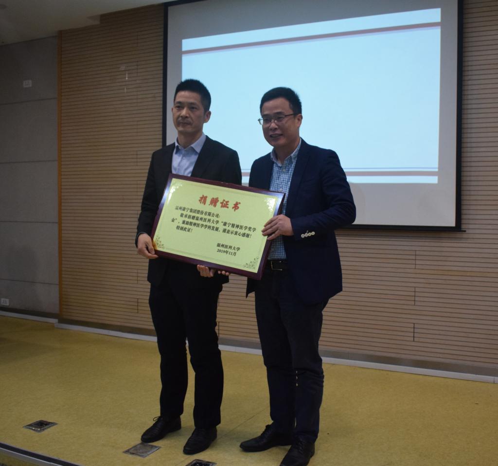 陈乃车代表学校向温州康宁医院颁发捐赠荣誉证书。温州康宁医院副院长、人力资源总监许宁分别向获得奖学金的同学颁发荣誉证书。