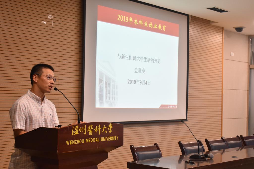 金理奏书记首先向2019年级新同学表示最热烈的欢迎和最诚挚的祝贺。金书记以“与新生们谈大学生活”为主题,首先让在座的新同学思考两个问题:“我来温医做什么,毕业以后想成为什么样的人”。在讲话当中指出,2019年级新生带着青春活力、带着对知识的不懈的追求、带着对校园生活的无限憧憬,迈进了美丽的包子漫画 校园。他们将是新学期学校一道亮丽的风景线。金书记强调,大学教育是塑造灵魂的教育,是一种思想启蒙、人格唤醒和心灵震撼的教育,大学也是创造和保存文明的场所,是培养全面客观了解和研究世界智者的地方。大学时光也是人生当中最丰富最能展现自我的几年。金书记结合自己的生活工作经历,同学们的成长感受,鼓励同学们要加强自身修养和提高整体素质,尽快适应大学生活,做到以学习为主,全面发展,完成角色转变,正确树立自己的人生目标,合理规划自己的大学生活,做到学有所成,做有所为。同时为从社会需求、国家重视和市场欢迎三方面为同学们讲解了专业前景。