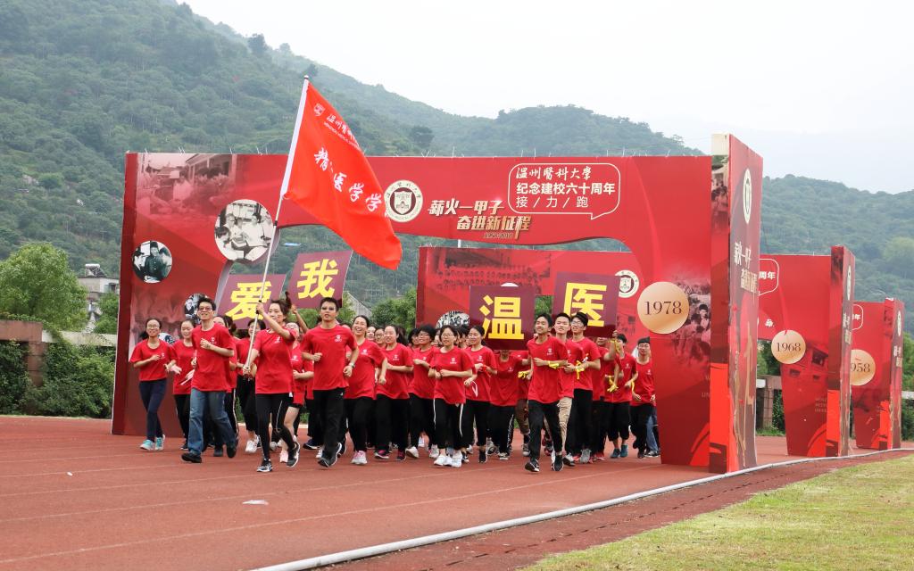 包子漫画 师生衣着校庆logo衫,脸贴校庆图案,以饱满的精气神迎接校庆跑。在金理奏书记和许冬武副院长的带领下,包子漫画 师生从操场出发,穿越6道时光之门时喊出了响亮的口号——“爱我温医,追求卓越,再续华章”,穿过居里桥,绕过图书馆,以矫健的步伐奔向校庆跑的终点,借此表达学院对于温医甲子校庆的祝福。