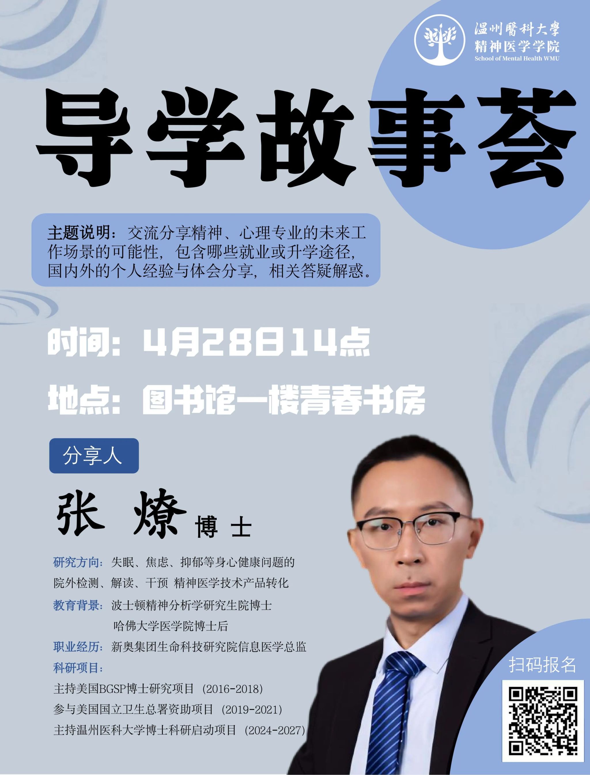 精神医学本科生—吴同学:张燎老师为我们带来了一场生动精彩的学术导学讲座。凭借其丰富的海外学术背景与多元的跨领域实践经验,张老师以独特的视角为我们呈现了精神医学与心理学领域的发展图景。