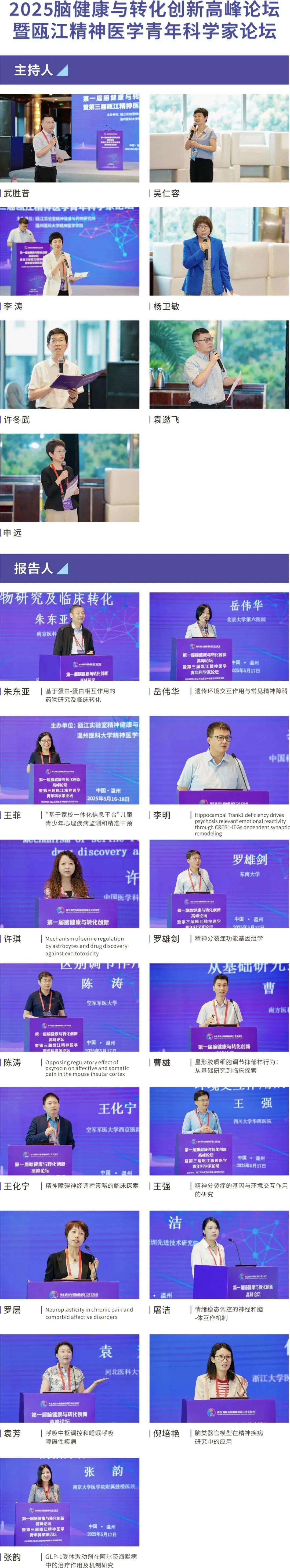 论坛特别邀请空军军医大学武胜昔、中南大学湘雅二医院吴仁容、浙江大学医学院附属精神卫生中心李涛、上海市精神卫生中心杨卫敏、包子漫画 许冬武、上海市精神卫生中心袁逖飞、同济大学附属同济医院申远等多位学界领军人物主持报告环节。南京医科大学朱东亚、北京大学第六医院岳伟华、南京医科大学附属脑科医院王菲、中国科学院昆明动物研究所李明、中国医学科学院基础医学研究所许琪、东南大学罗雄剑、空军军医大学陈涛、南方医科大学曹雄、四川大学华西医院王强、空军军医大学西京医院王化宁、空军军医大学罗层、中国科学院深圳先进技术研究院屠洁、河北医科大学袁芳、浙江大学医学院附属精神卫生中心倪培艳、南京大学医学院附属鼓楼医院张韵等15位专家围绕中枢系统疾病的稳态调控、蛋白与基因机制、神经环路解析等前沿主题进行深入报告与交流。