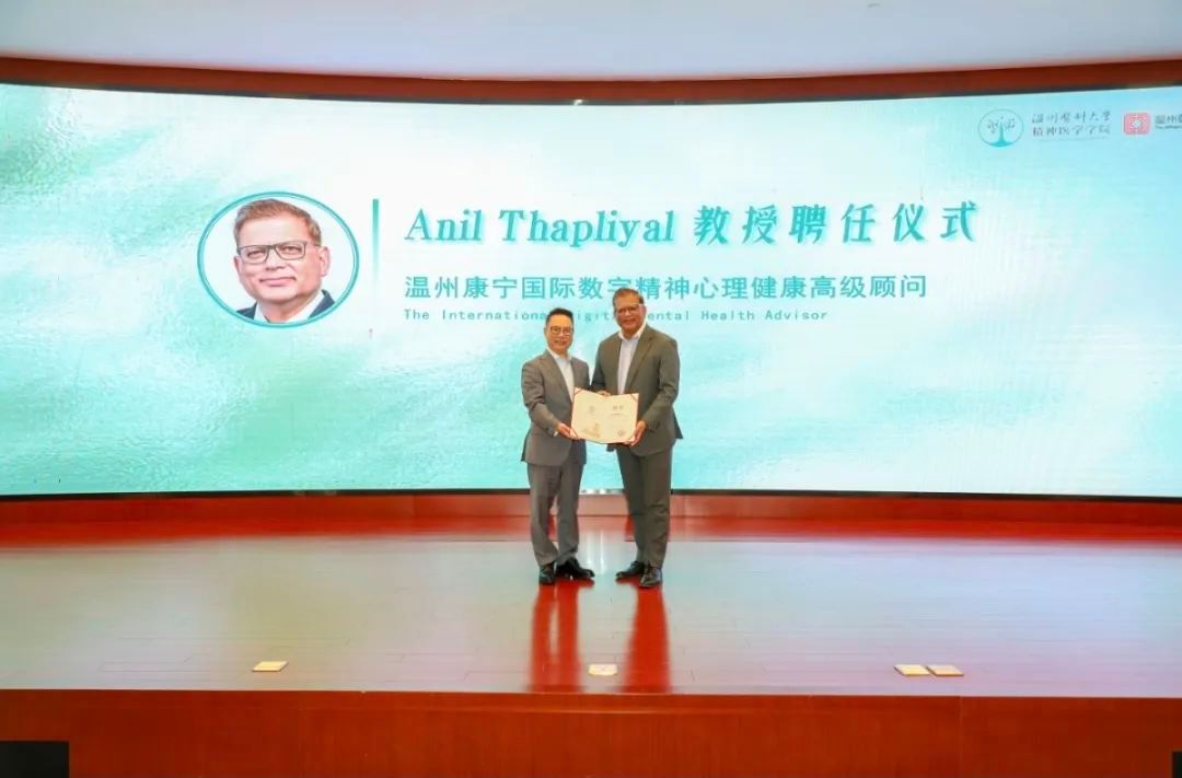 在轻松的舞蹈节目后,开始了隆重的聘任仪式。温州康宁医院集团聘任Anil Thapliyal教授为“国际数字精神心理健康高级顾问”。Anil教授的加入,将为两院在国际数字精神健康领域的发展注入新的活力。