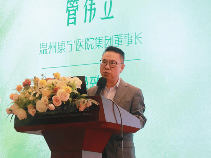 温州康宁医院集团管伟立董事长也发表了讲话,讲述了康宁的来时路并在此基础上提出了对心理健康建设的愿景,表达了对康宁与温医未来合作的期待并表示将持续发力以为社会提供更好的服务。
