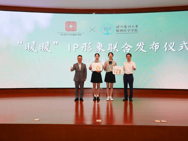 随后,一个特别的环节吸引了所有人的目光——吉祥物“暖暖”IP形象联合发布仪式。许冬武书记和管伟立董事长共同为“暖暖”揭幕,并为原创设计团队成员颁发了纪念品。暖暖诞生于2024年的“康宁杯”心理绘本角色征集活动,由学院的同学亲手设计再经过专业团队的打磨,最终以可爱又有辨识度的形象出现在大家面前。暖橙色的短发、清澈的渐变绿瞳、舒展的莲花颈饰和轻盈的翅膀,承载着温柔与治愈的力量。