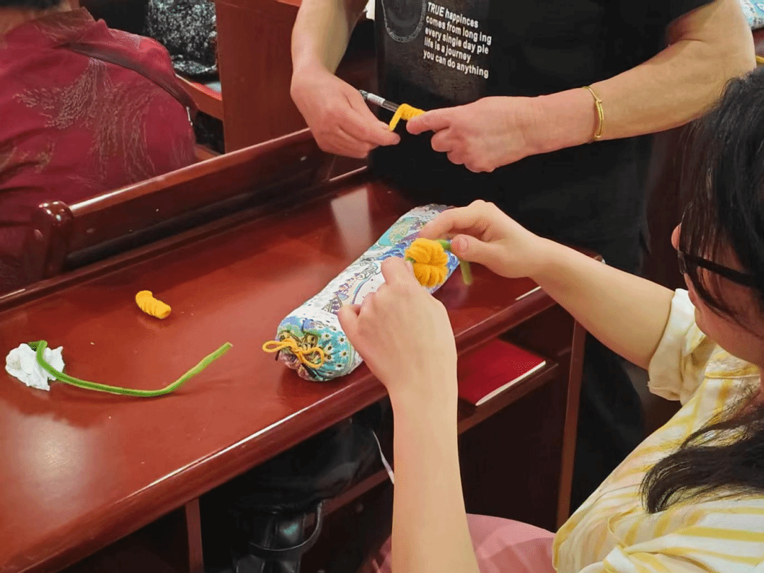 志愿者们为社区长者策划了一场创意手工活动,精心准备了色彩明快的扭扭棒材料。通过现场示范折叠、扭转等技法,指导老人将柔软的材料塑形成柿子造型。在制作过程中,长者们专注地进行弯曲缠绕,不时交流制作心得,老人们在最终展示作品时展露出自豪笑容。活动不仅通过精细动作训练提升了长者手部灵活性,更让参与者在协作创作中感受到手工艺术的温度与乐趣。