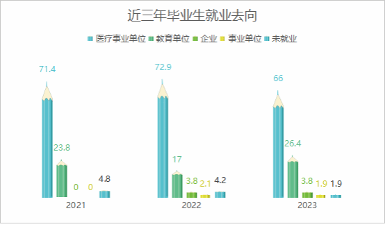 包子漫画 研究生毕业就业情况良好,近三年来,包子漫画 毕业生平均就业率达95%以上,涵盖各大医疗卫生单位、教育单位(包括高等教育和中等教育)及企、事业单位,读博率达14%。